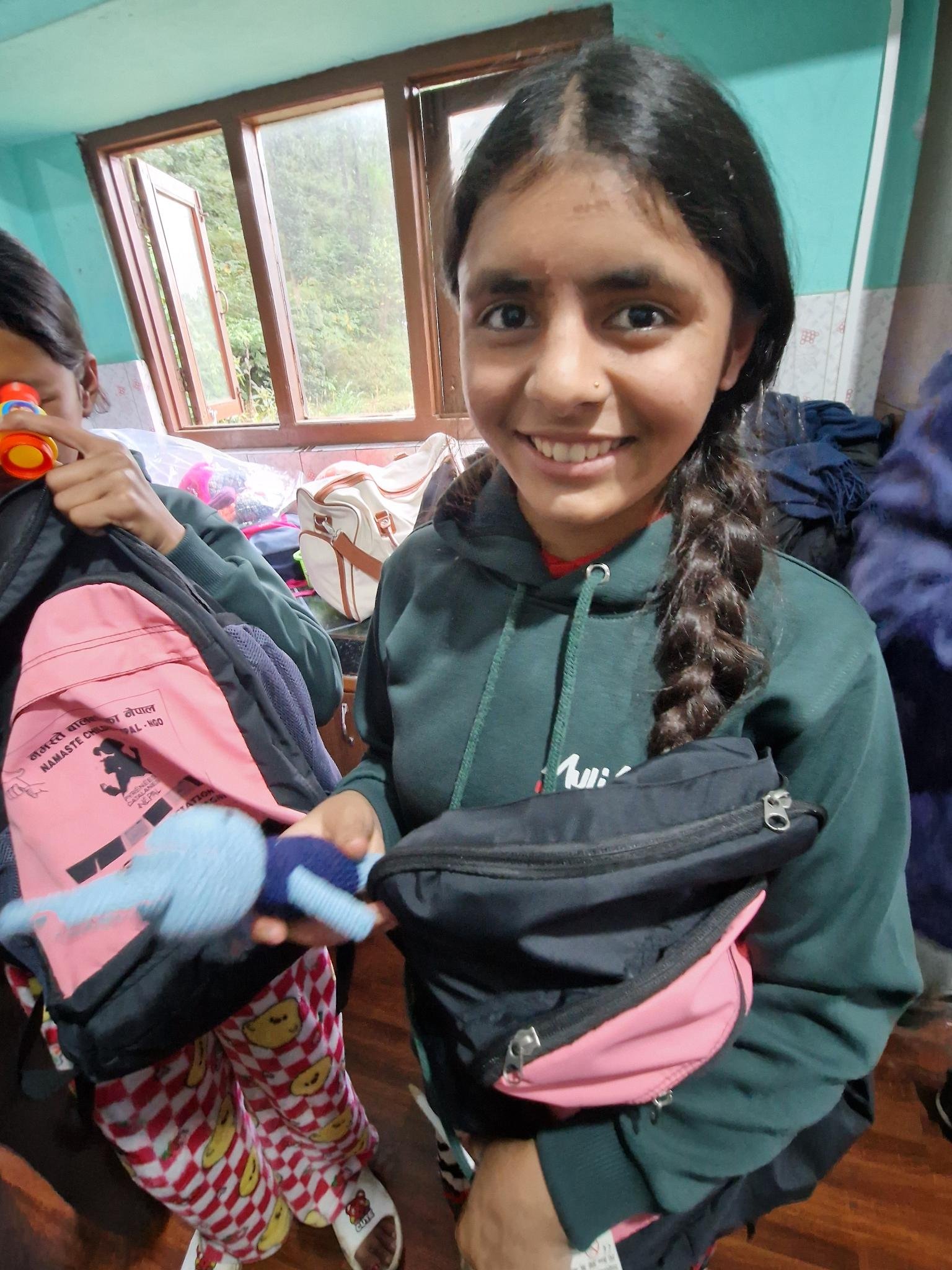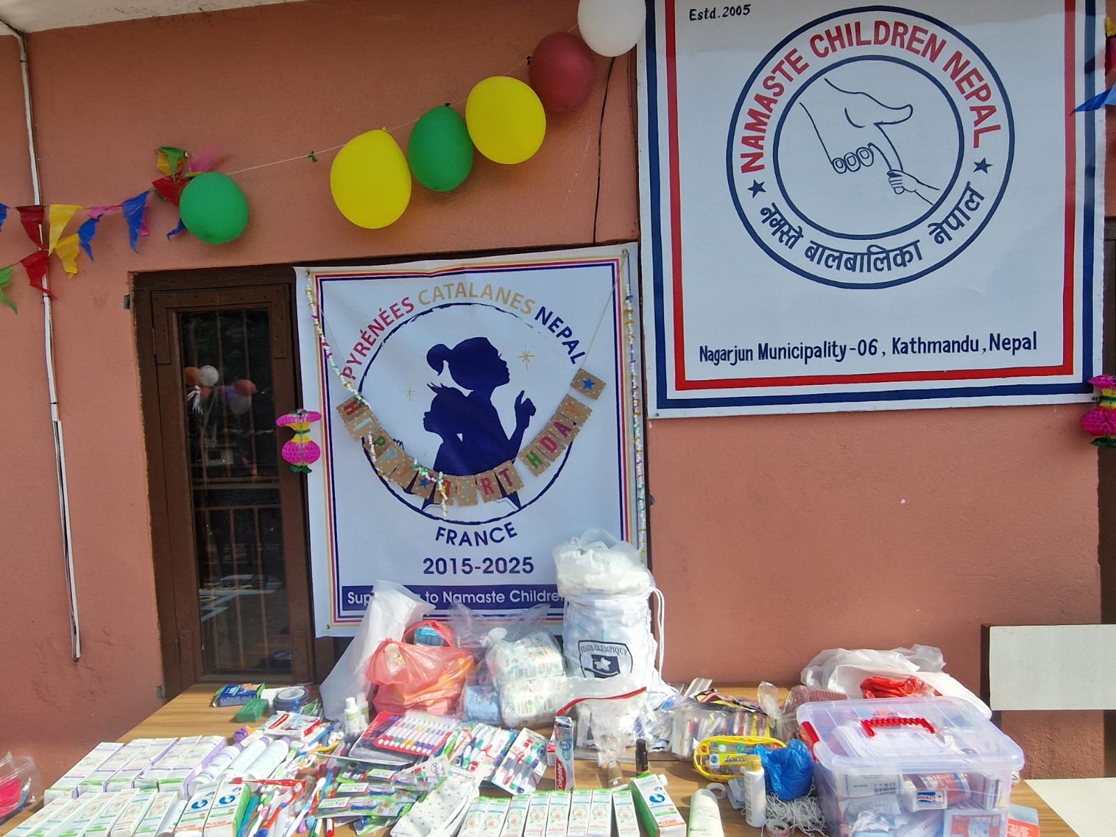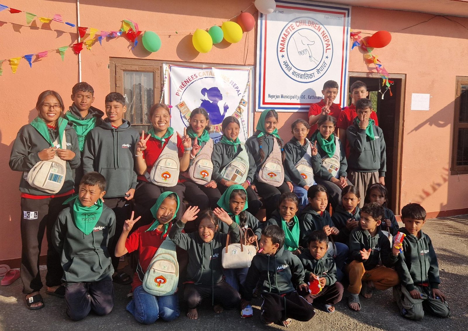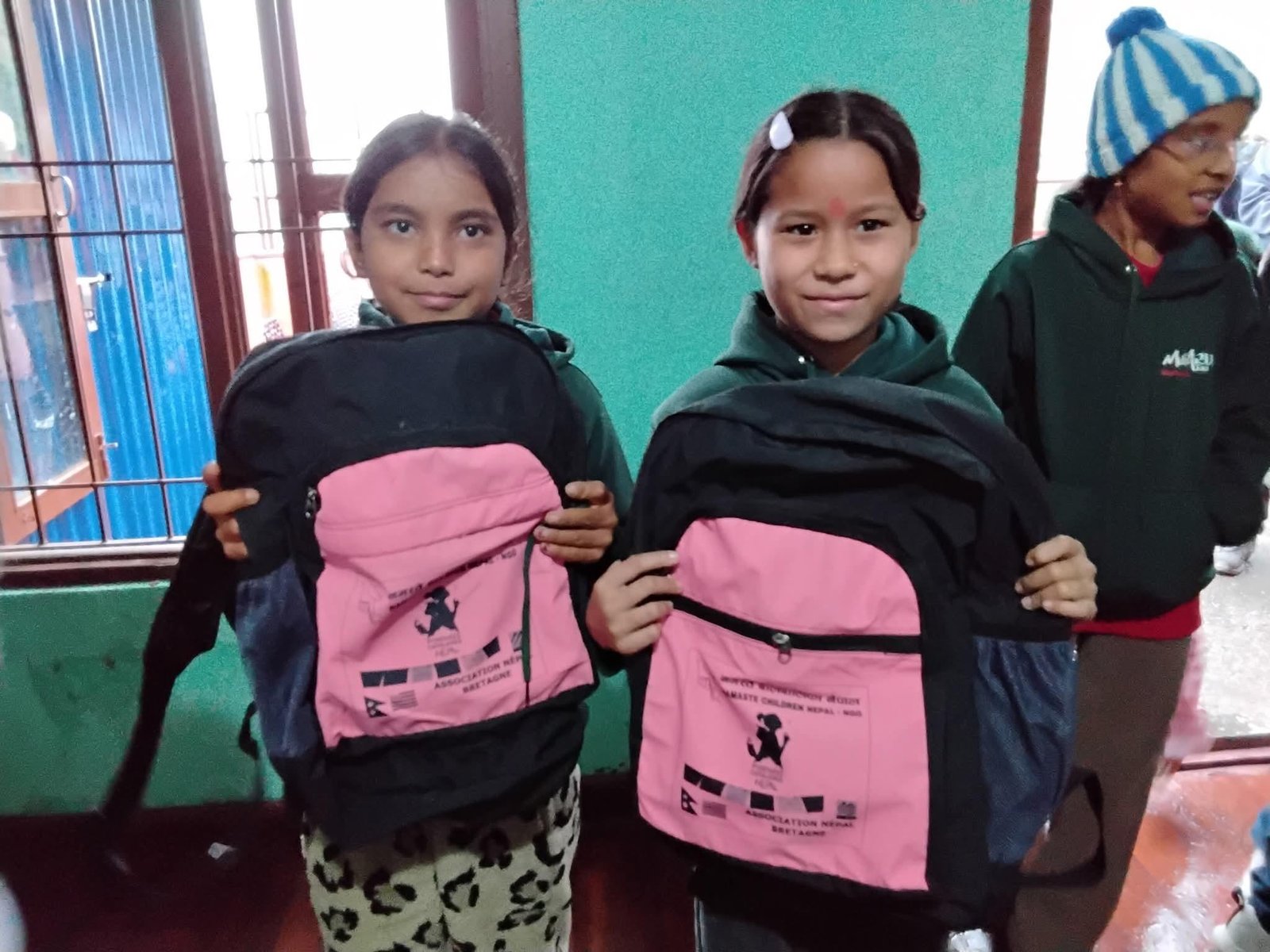 Puis un sac à dos pour l’école avec les 3 logos : Namaste Children Nepal, Nepal Bretagne Asso et Pyrénées Catalanes aide au Népal – Pharpu