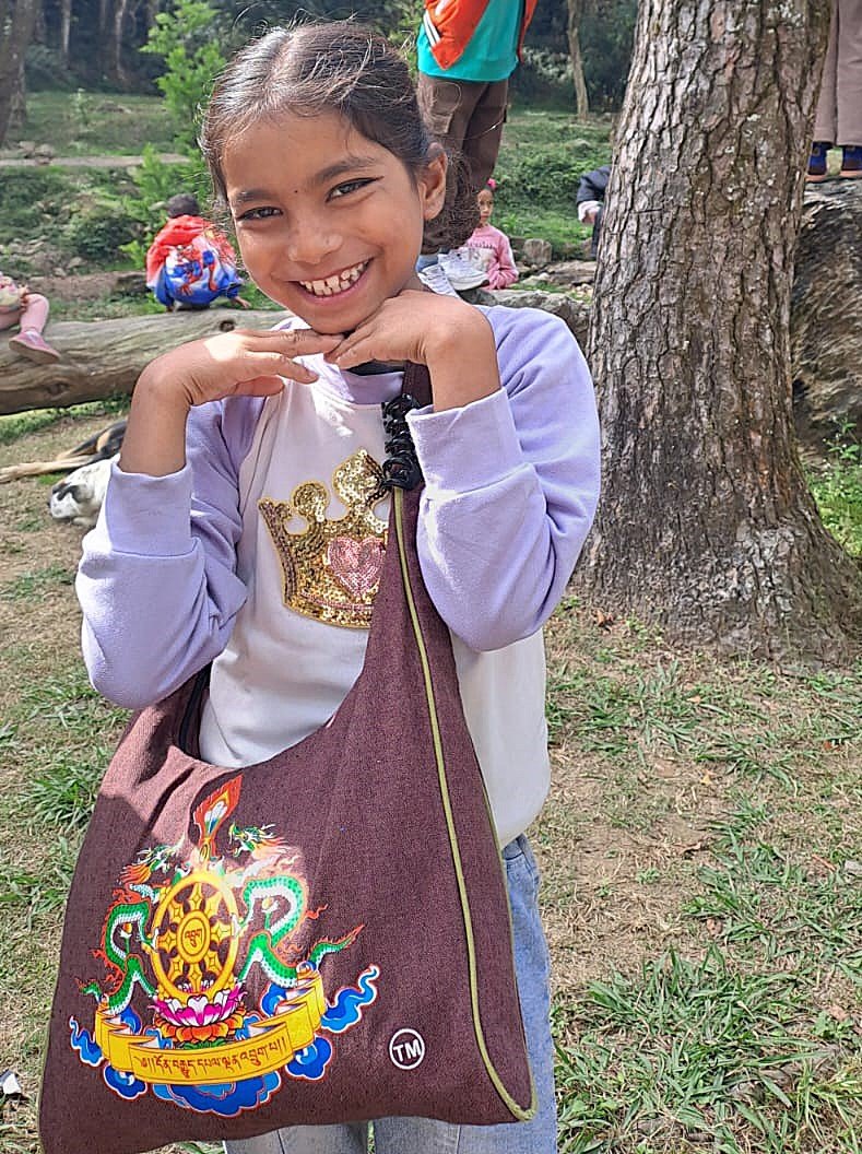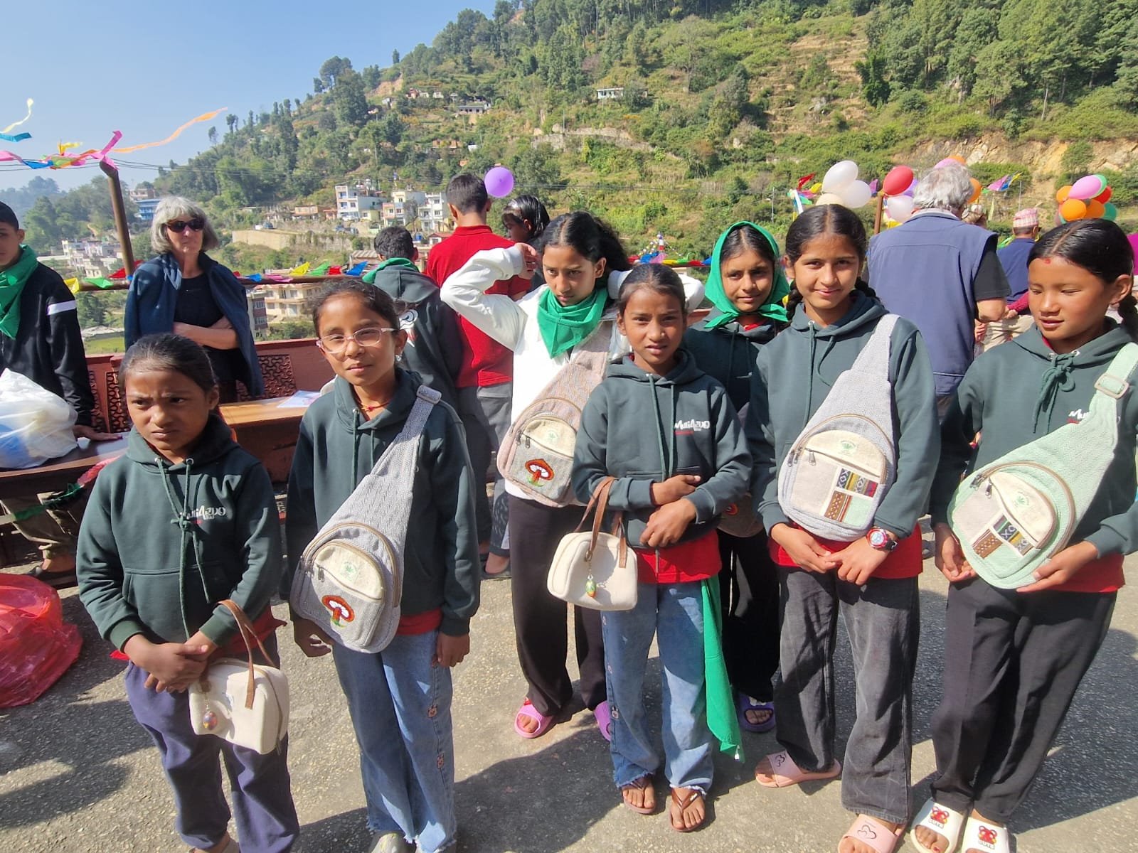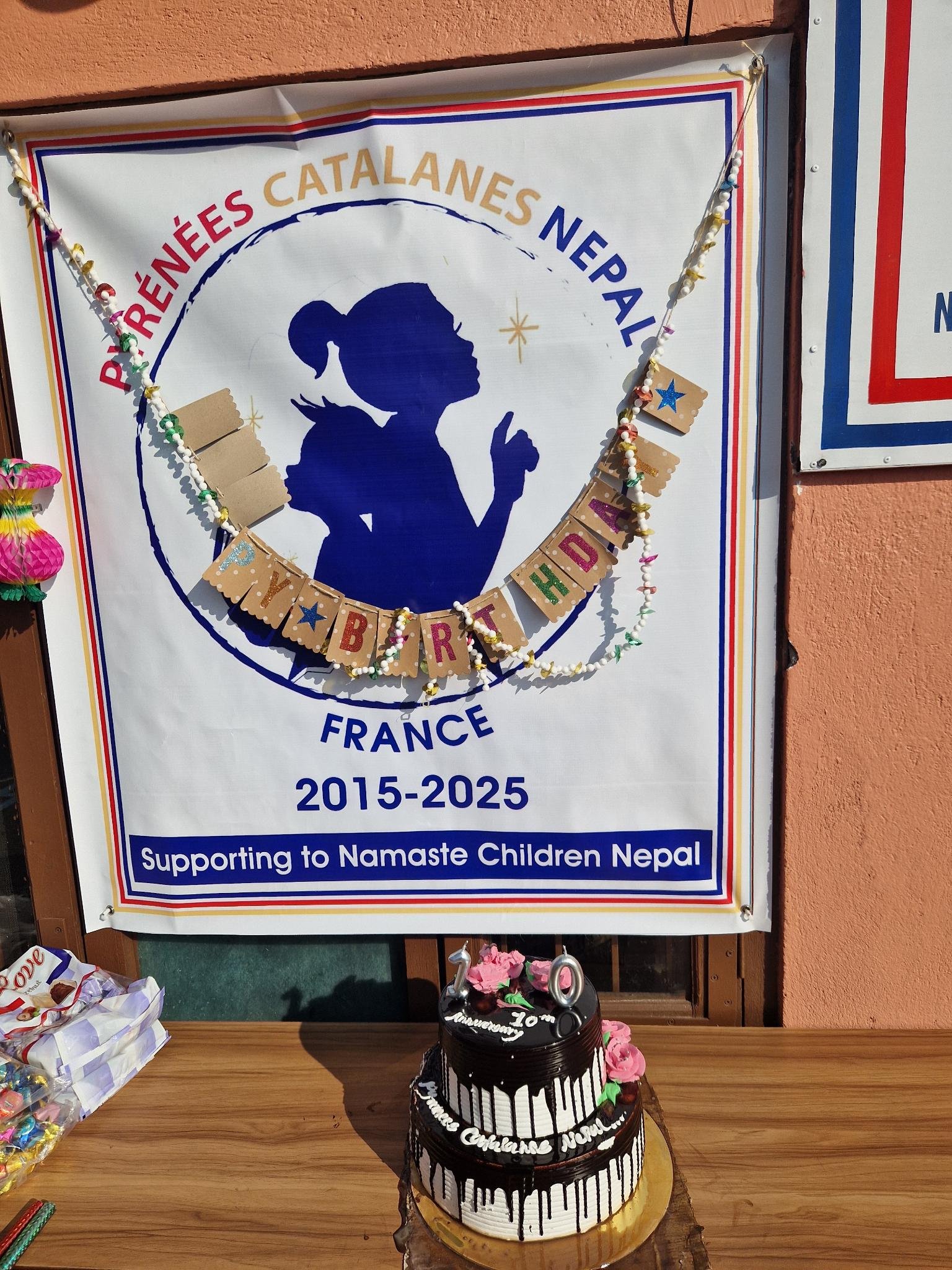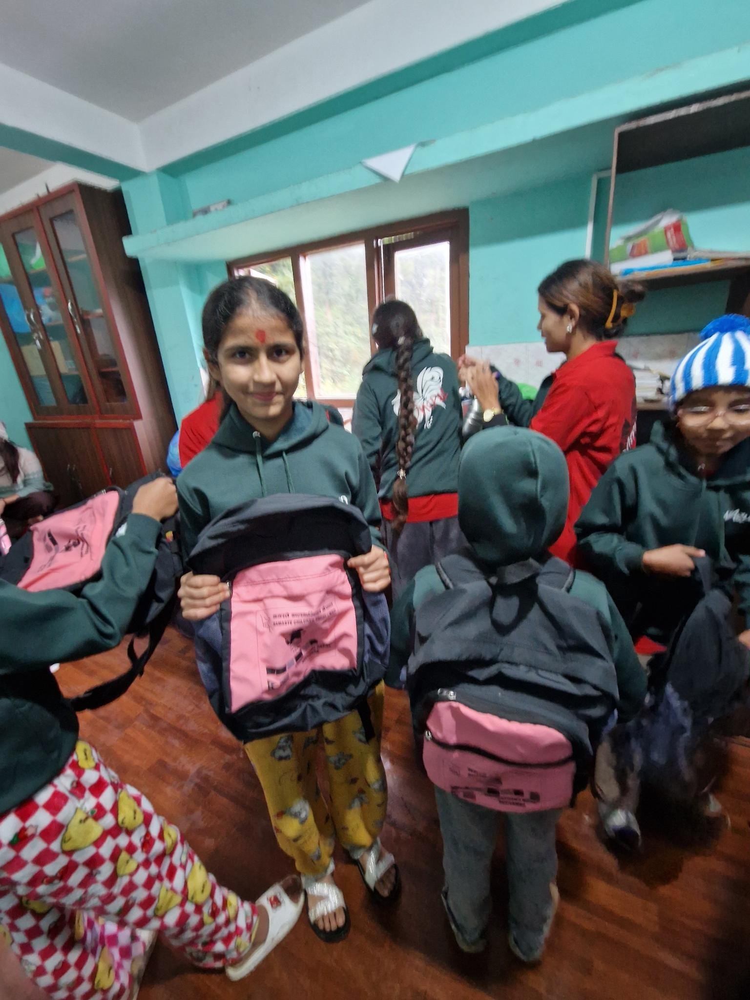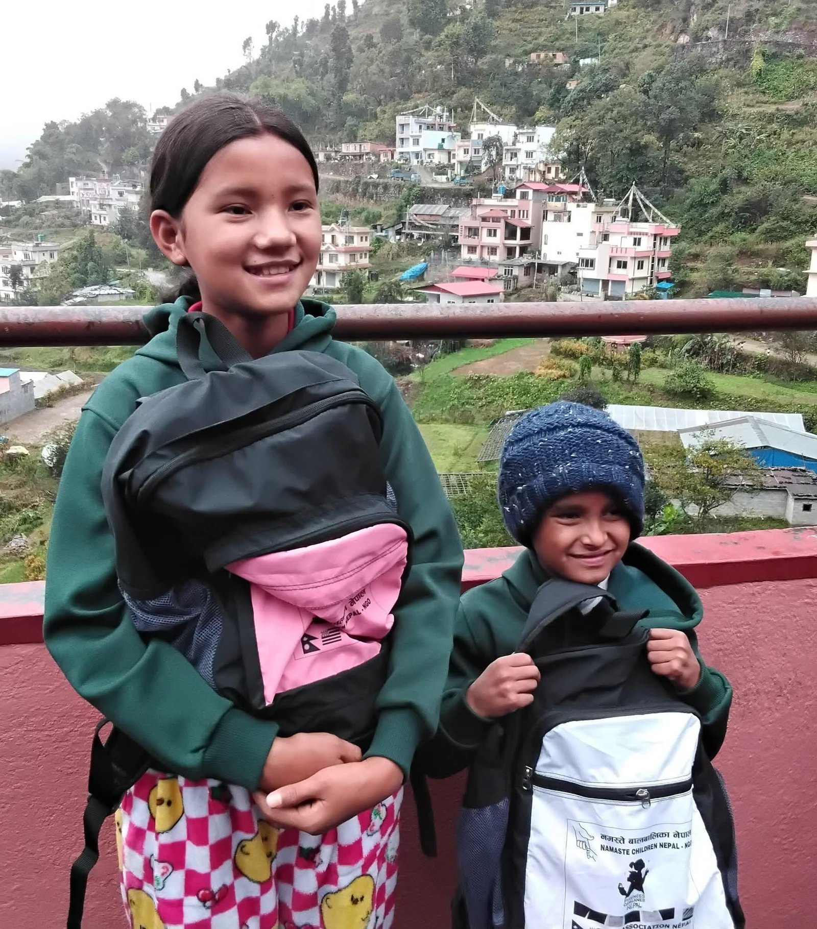 Puis un sac à dos pour l’école avec les 3 logos : Namaste Children Nepal, Nepal Bretagne Asso et Pyrénées Catalanes aide au Népal – Pharpu